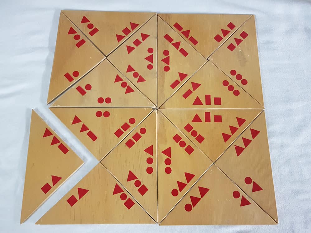16 wooden triangle shapes all with a range of different patterns on them - find the matching pattern to finish the puzzle.