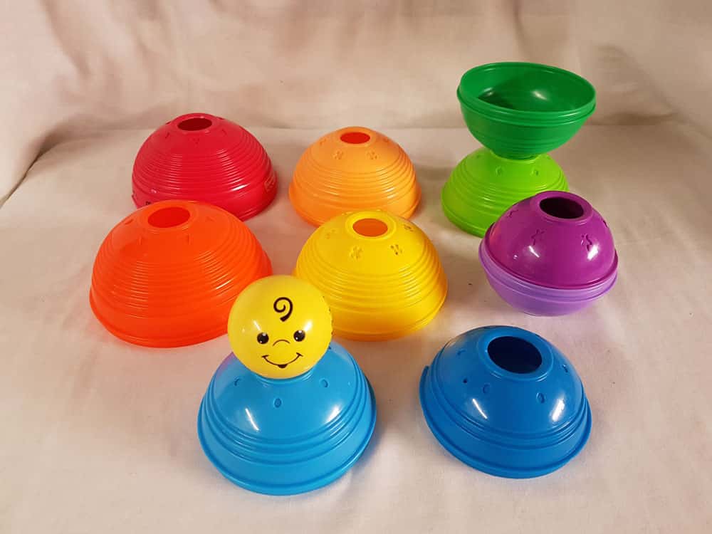 Includes 10 colorful cups to grasp, stack or nest, with grooved surfaces for a snug fit and easy stacking.