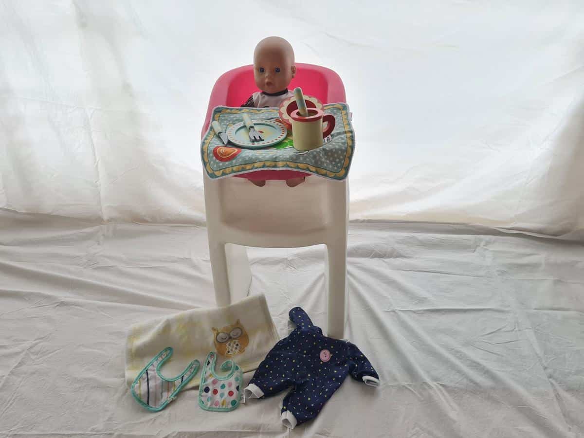 All your favourite dolls and teddies can sit in the highchair and get fed.