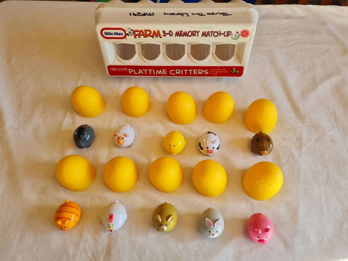 Split each animal top and bottom apart and hide each half under haystack cups, then mix them up and see if you can remember where it was placed!