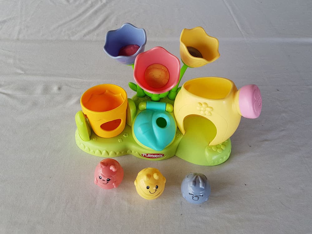 Includes: 3 balls and play set that features a tip and roll barrel, 3 jiggle flowers and a put n take watering can.