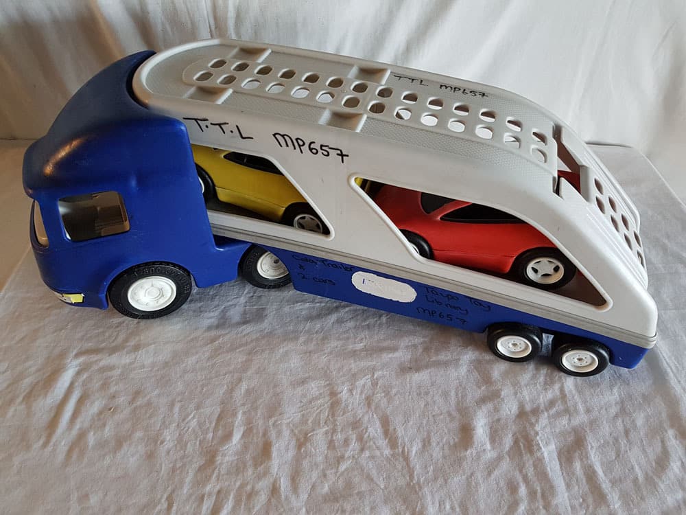 - Two sports cars (one red, one yellow) are included with the car carrier toy.