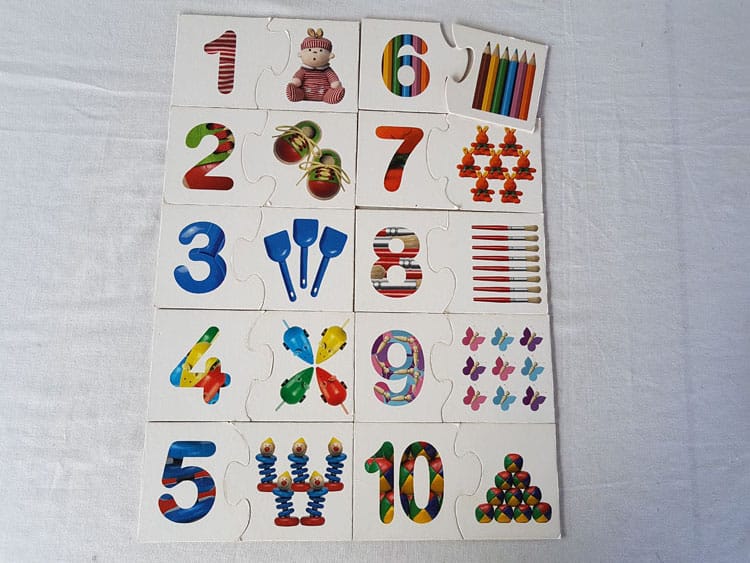 20 puzzle pieces that use numbers, pictures and colours to make the matches for numbers 1 - 10.