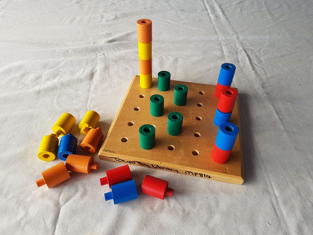 The wooden pegs can be slotted into the holes on the base board, or stacked up on top of each other.