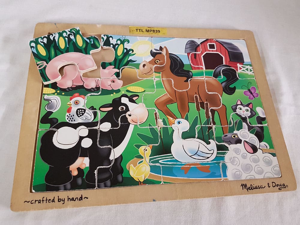 The duck is in the pond and the pig is in the corn in this 12-piece wooden jigsaw puzzle featuring a happy farm scene.