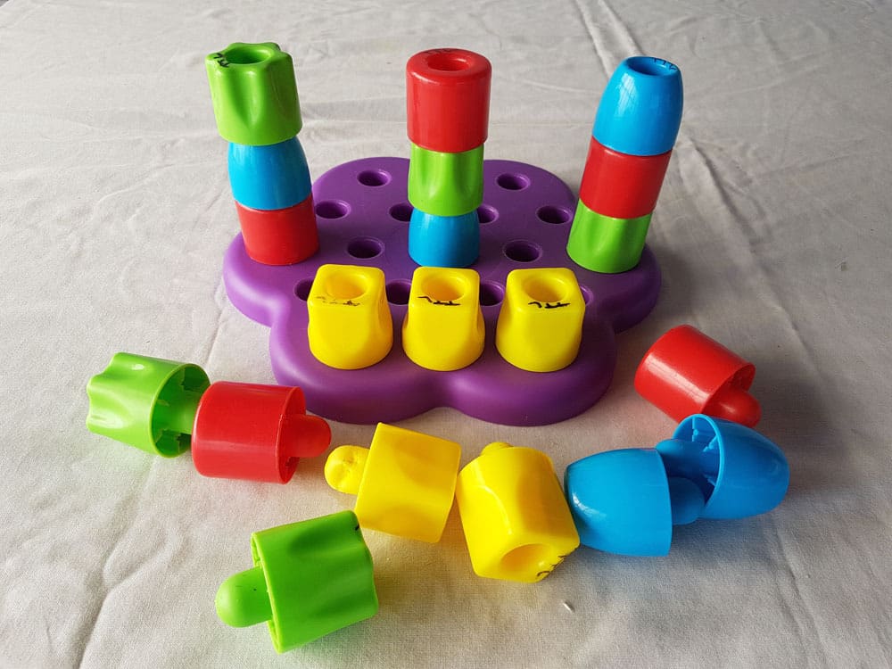 1 x purple base plate 20 x plastic pegs (5 of each colour - red, yellow, blue and green)